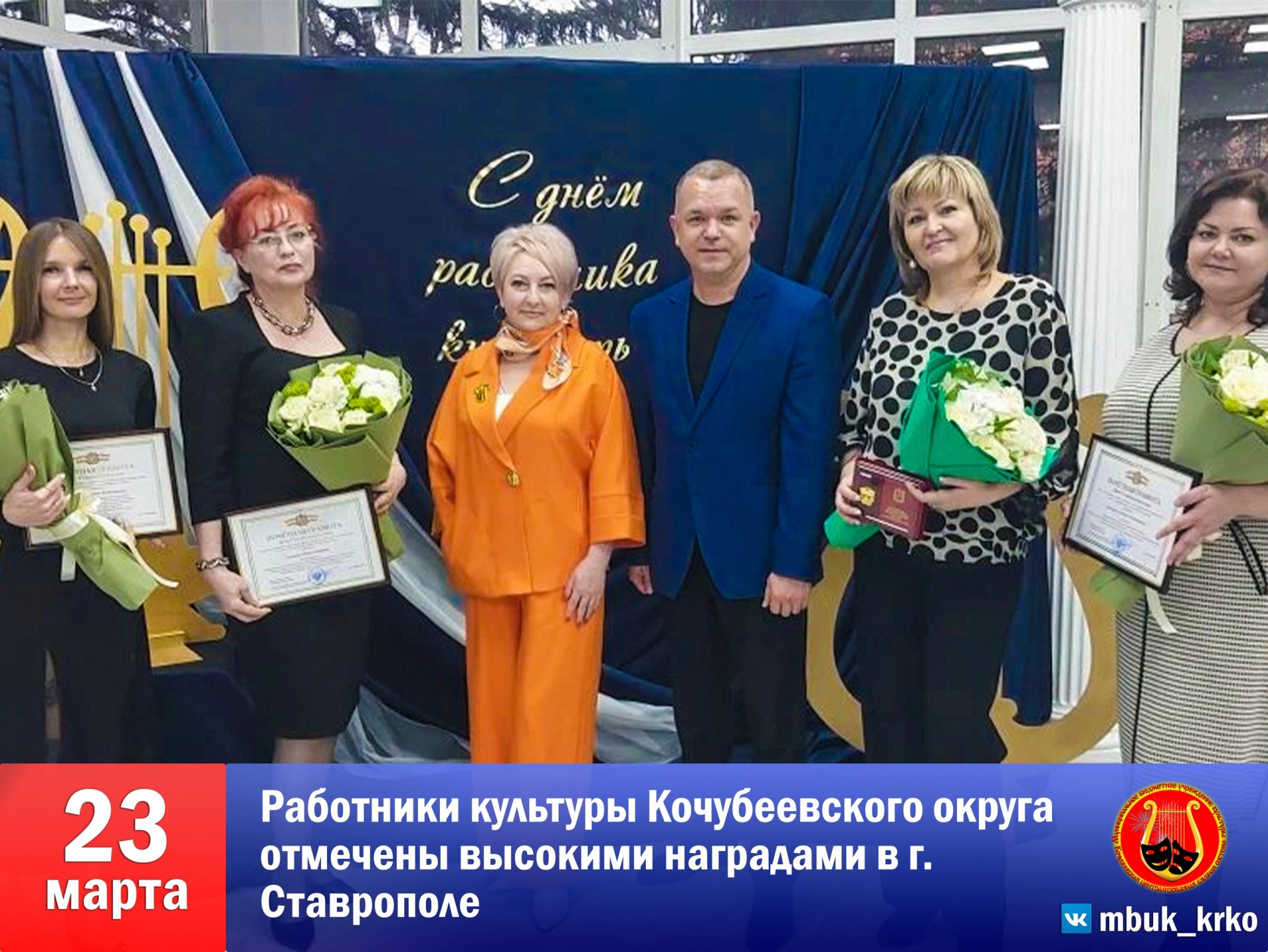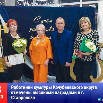5В преддверии Дня работника культуры, который в России отмечается 25 марта, в краевой столице состоялось торжественное чествование деятелей искусства и просвещения. В праздничной обстановке почетные грамоты, благодарственные письма и медали из рук представителей Правительства и Думы Ставропольского края получили лучшие из лучших, в числе которых — представители сферы культуры Кочубеевского округа.