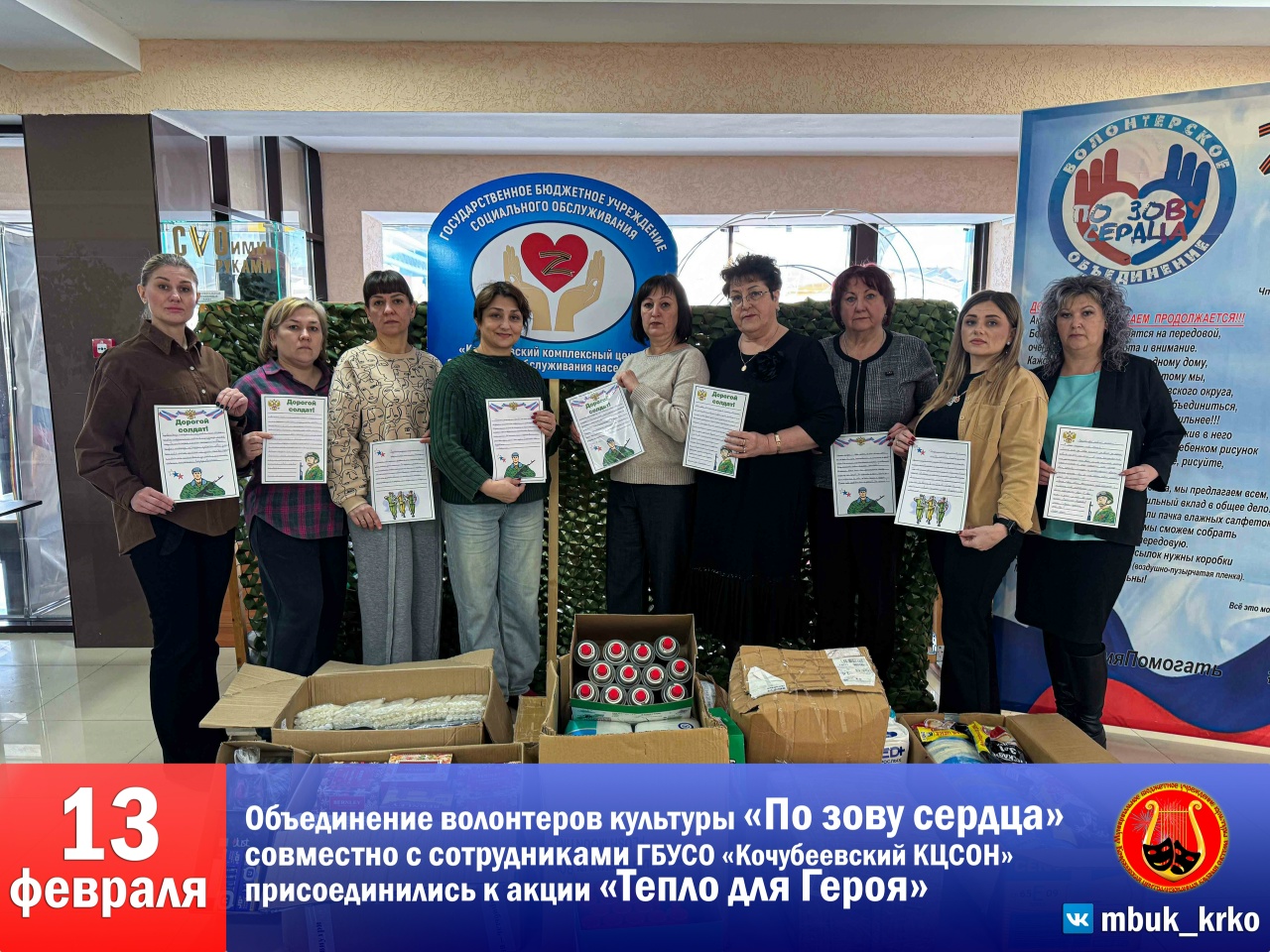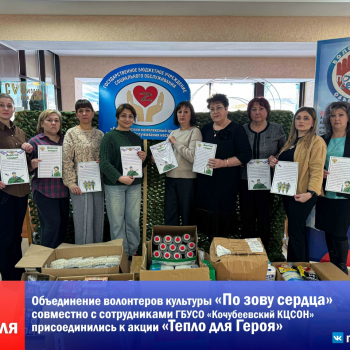 В преддверии праздника объединение волонтеров культуры «По зову сердца» совместно с сотрудниками Кочубеевского комплексного центра социального обслуживания присоединились к акции «Тепло для Героя», объединив усилия, чтобы подарить защитникам России внимание, заботу и тепло.